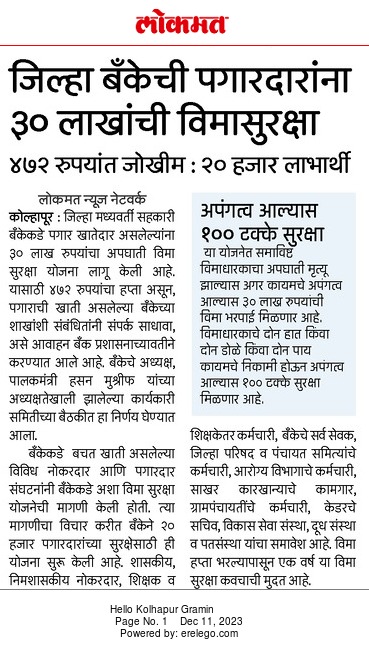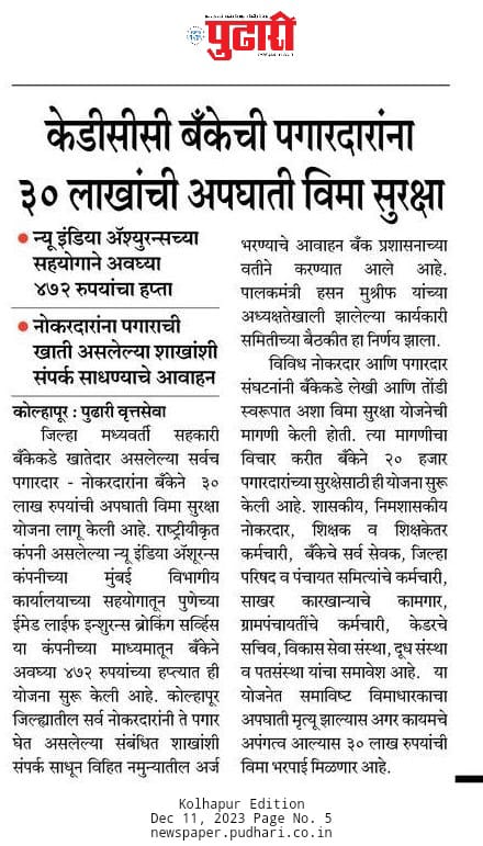 केडीसीसी बँकेकडून शेतकऱ्यांना दोन लाखांचा अपघाती विमा लवकरच निविदा मागवून पगारदार खातेदारांसाठीही आणणार सामूहिक विमासुरक्षा योजना अध्यक्ष व मंत्री हसन मुश्रीफ यांची माहिती.