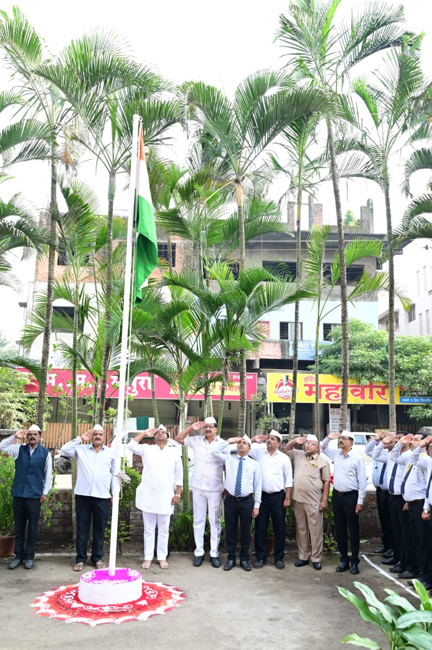 कोल्हापूर, दि.१५: कोल्हापूर जिल्हा मध्यवर्ती सहकारी बँकेच्या प्रांगणात ७६ व्या स्वातंत्र्य दिनानिमित्त बँकेचे उपाध्यक्ष व आमदार राजूबाबा आवळे यानी ध्वजारोहण केले. यावेळी बँकेचे संचालक प्रताप उर्फ भैया माने, कर्मचारी प्रतिनिधी दिलीप लोखंडे व आय. बी. मुनशी, प्रभारी मुख्य कार्यकारी अधिकारी जी. एम. शिंदे, केंद्र कार्यालयासह कोल्हापूर शहरातील सर्व शाखांचे अधिकारी व कर्मचारी उपस्थित होते. …………. कोल्हापूर: केडीसीसी बँकेच्या प्रांगणात बँकेचे उपाध्यक्ष व आमदार राजूबाबा आवळे यांच्या हस्ते ७६ व्या स्वातंत्र्य दिनानिमित्त ध्वजारोहण झाले. यावेळी संचालक प्रताप उर्फ भैय्या माने, प्रभारी मुख्य कार्यकारी अधिकारी श्री. जी. एम. शिंदे व इतर प्रमुख.