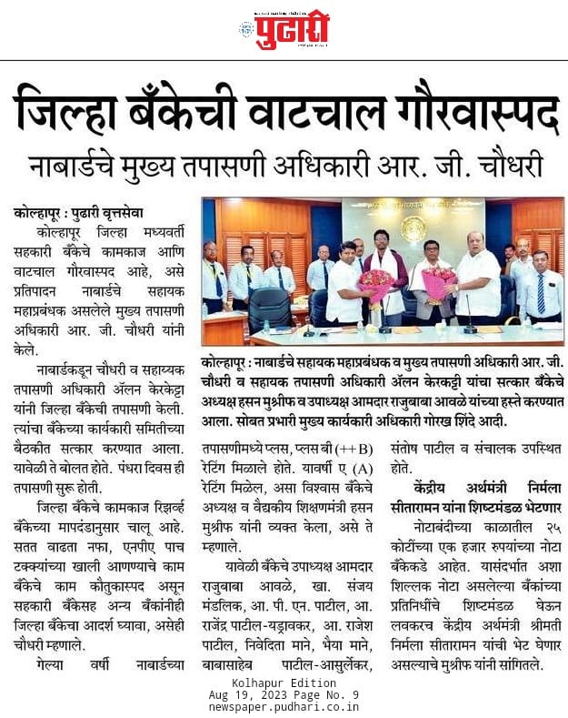 वैकुंठ मेहता राष्ट्रीय सहकार व्यवस्थापन संस्थेचे प्रकल्प संचालक बी. किशोर म्हणाले, बँकेचे अध्यक्ष व वैद्यकीय शिक्षण मंत्री हसन मुश्रीफ यांच्या नेतृत्वाखाली बँकेने गरुडझेप घेतली आहे. प्रतिकूल परिस्थितीतही काटकसरीचा, पारदर्शी कारभार या जोरावर बँकेने साधलेली प्रगती नेत्रदीपक आहे. बँकिंगमधील दैनंदिन व्यवहारात उपयोगी तंत्रज्ञानाच्या विकासासाठी आणि कृषी क्षेत्रात ए. आय. तंत्रज्ञानासाठी फंड उभा केल्याबद्दल तसेच शेतकऱ्यांना पाच लाखापर्यंत पिक कर्ज बिनव्याजी धोरण सर्वच बँकांना स्फूर्तिदायक आहे, असेही ते म्हणाले.