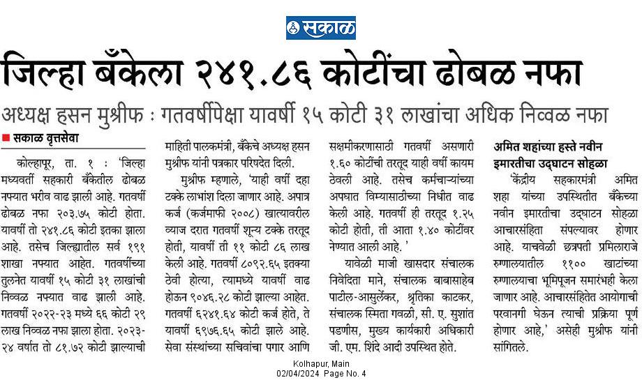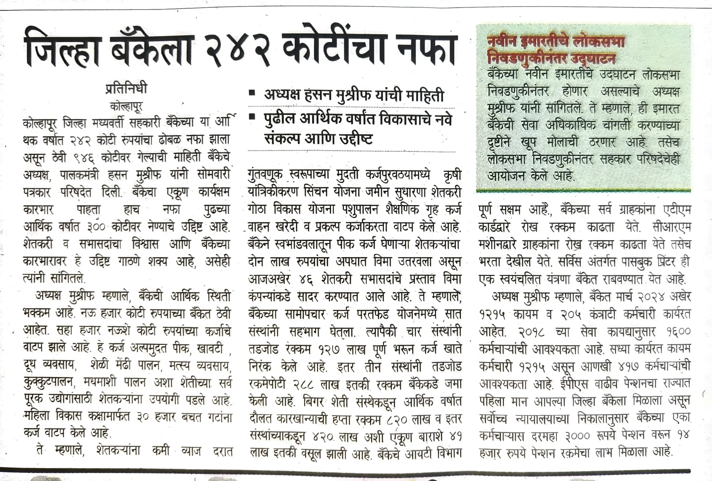 याबाबत अधिक माहिती अशी, कोल्हापूर जिल्हा मध्यवर्ती सहकारी बँकेने जिल्ह्यातील एकूण १९३७ विकास संस्थांच्या माध्यमातून २ लाख ६० हजार शेतकऱ्यांना सन २०२४-२५ या पीक हंगामाकरीता कर्ज वितरण केले होते. ३० जून २०२५ अखेर ₹ २५८७ कोटी वसूलपात्र शेती व पीक कर्ज रक्कमेपोटी एकूण ₹ २३३२ कोटी शेती व पीक कर्ज वसूल झालेले आहे.