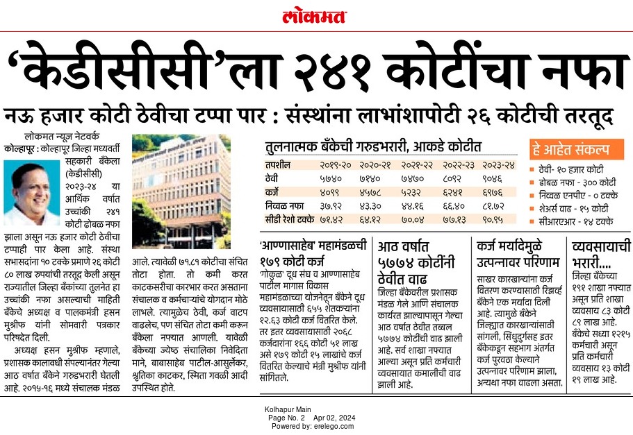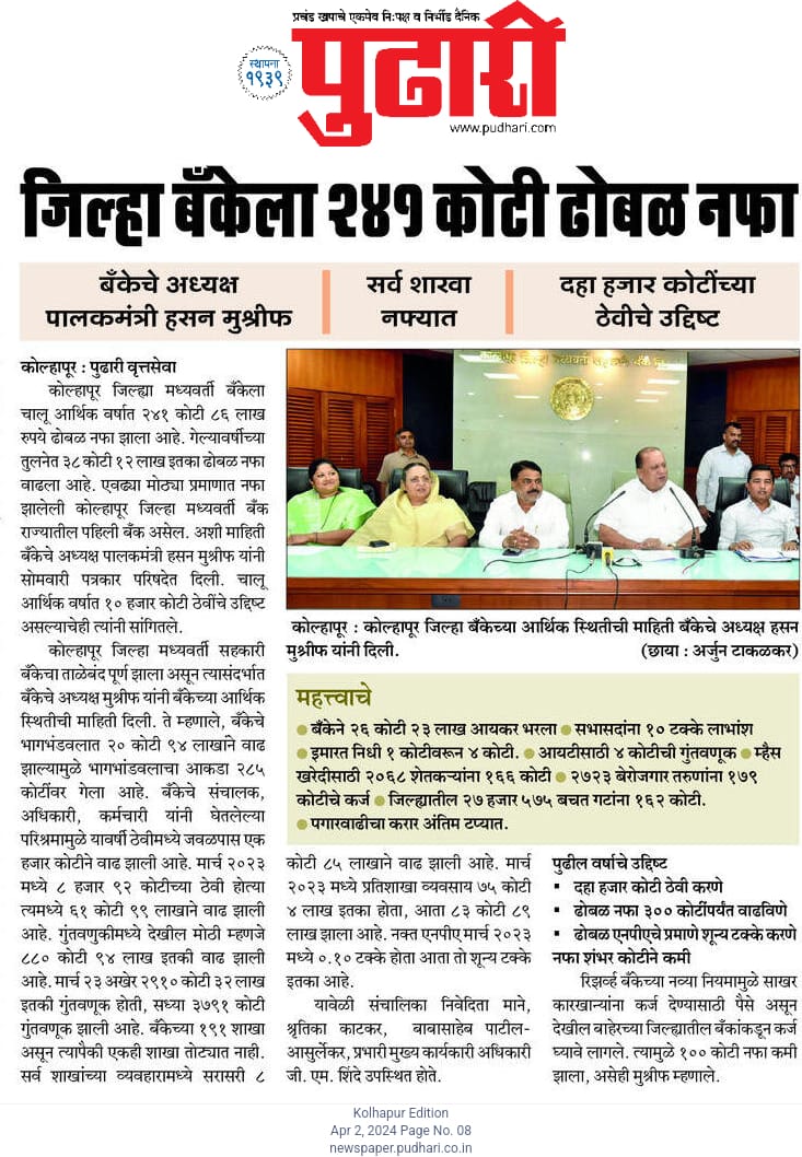 □ कोल्हापूर जिल्ह्यातील प्रकल्पांसाठी केडीसीसी बँक अग्रणी बँक म्हणून काम करेल.